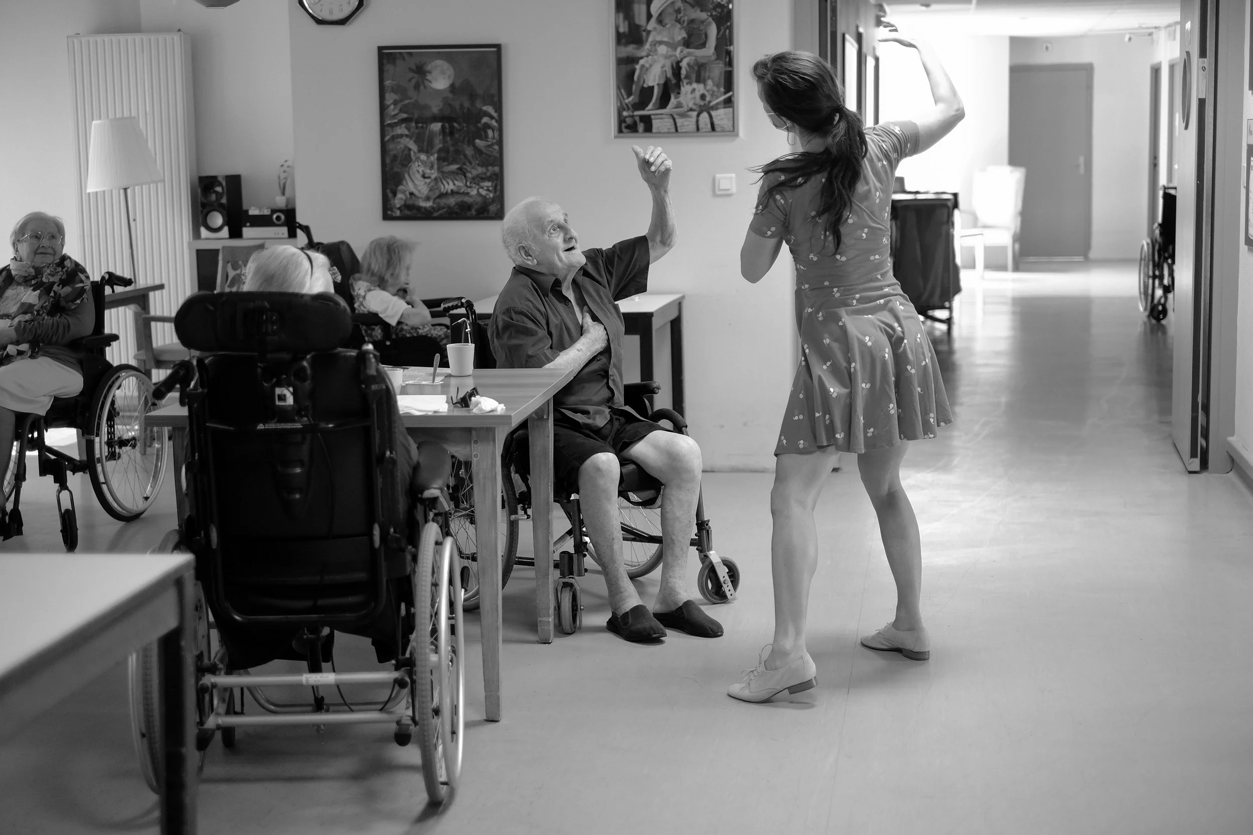 The artists connect with the residents through movement, dance, touch, music, song, presence and play. Depending on the individual, it could be a small dance with the eyes or hands, or more elaborate choreography. On every visit, we create spontaneous dance guided by the residents themselves. The artists fully immerse themselves in the residents’ world and improvise based on their current state, offering space for their expressive potential to emerge. They draw inspiration from the microcosm of the CHSLD, including the comings and goings of the care staff, the presence of family members, ambient sounds and smells, and the resident’s cognitive state and mood. Tears, shouts and laughter are all part of the experience. The visits require an active, engaged and compassionate presence.
