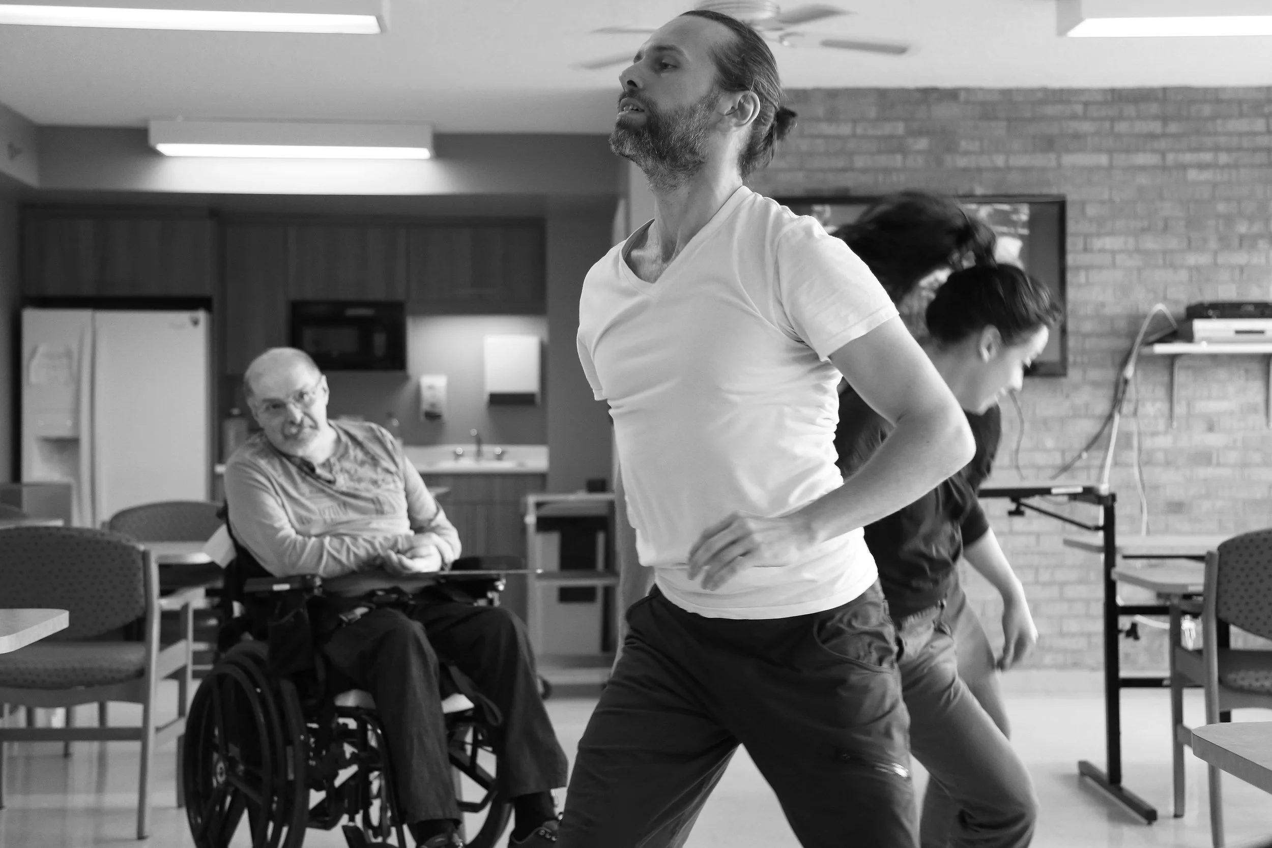 Les artistes se déplacent dans les corridors, les salles communes et surtout dans les chambres, dans le cadre d’une approche adaptée à chaque personne. Lors d’une rencontre, les artistes et les résident·es entrent en relation par le mouvement, la danse, le toucher, la musique, le chant, la présence et le jeu. Selon la personnes résidente, ce peut être une toute petite danse avec les yeux ou les mains, ou une proposition chorégraphique ou musicale plus élaborée. Nous créons à chaque visite une danse de l’instant à l’écoute des résident·es. Les artistes s’adaptent à l’univers de ces dernier·ères pour improviser à partir de leur état présent, afin de faire émerger tout un potentiel d’expression.